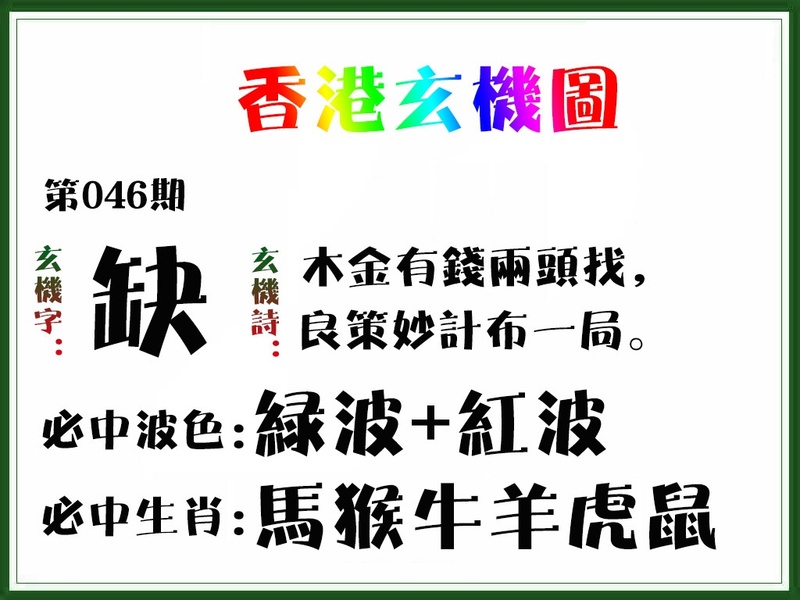| 046期:五肖 | 马猴兔羊鼠 | ?00中 |